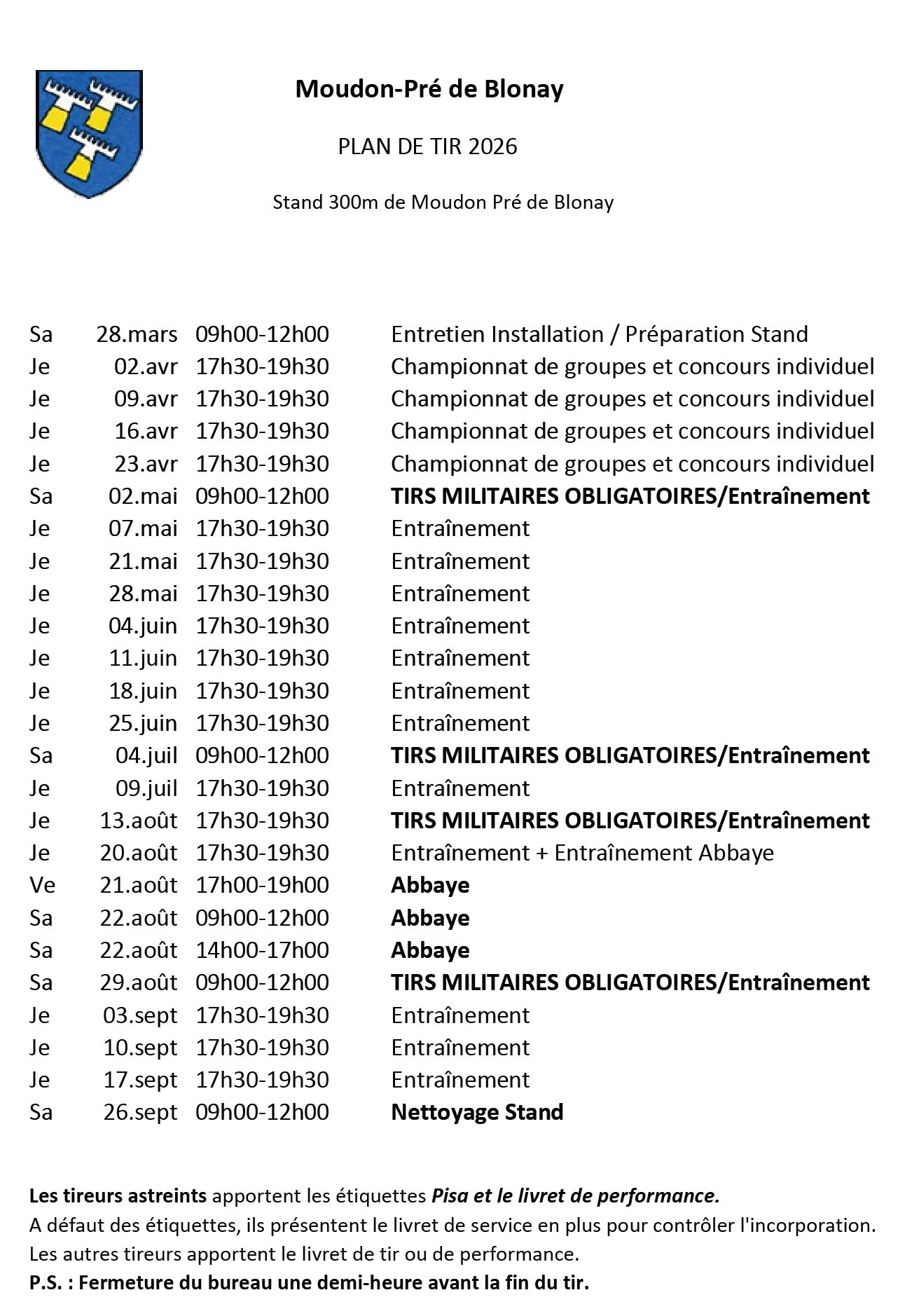 Programme des tirs à Moudon - saison 2025