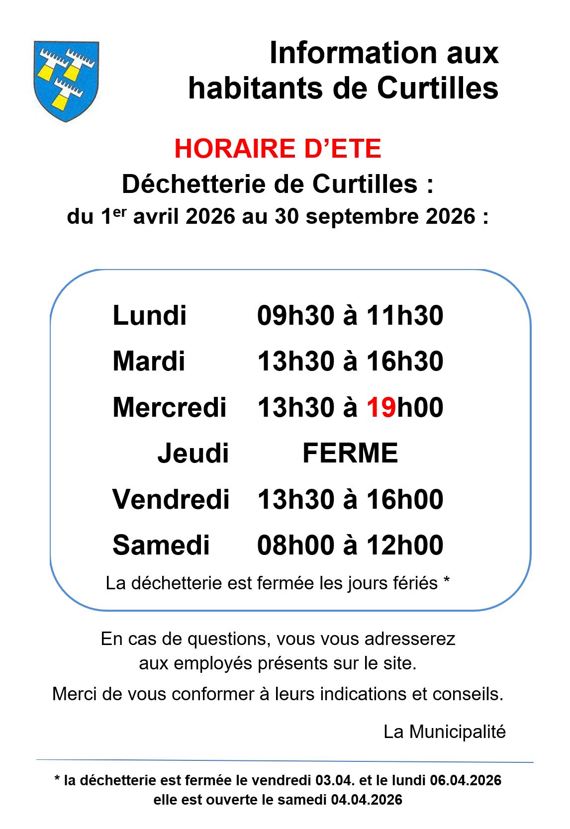 Les déchets ménagers sont à éliminer dans la benne La Grignoteuse, située derrière le Collège (du lundi au samedi de 07h00 à 20h00)